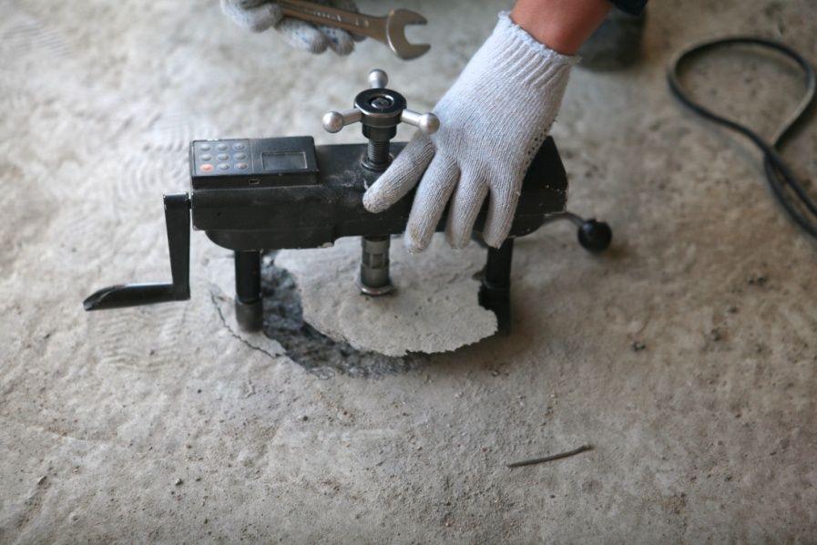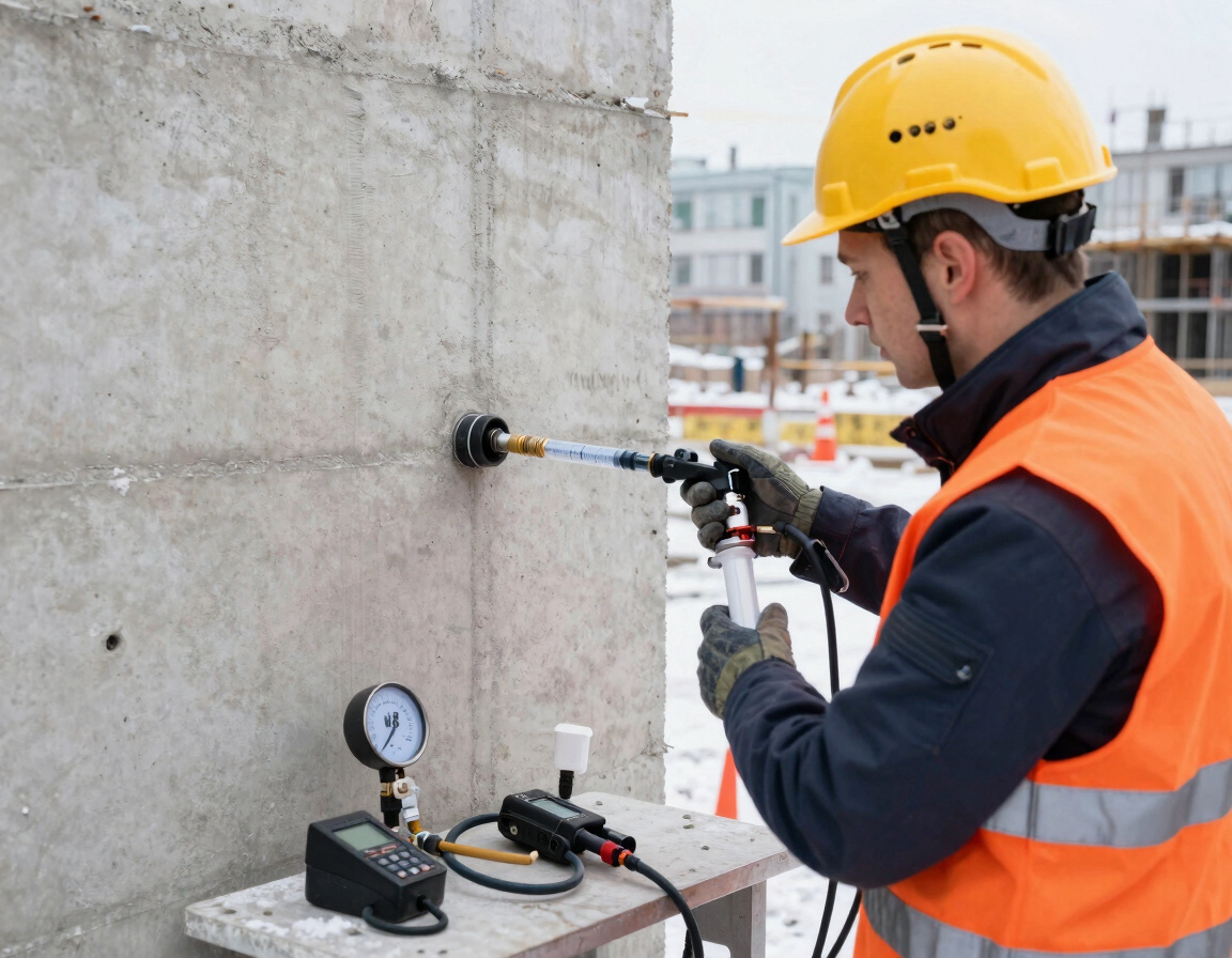 Специальный захват отрывает маленький диск (50 мм) с края конструкции. По усилию отрыва определяют поверхностную прочность. След минимальный — метод считается неразрушающим.
