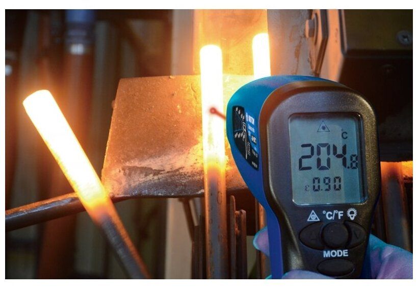 Инфракрасный пирометр ловит тепловое излучение поверхности — точка температуры за секунду. Бесконтактно. Контроль режимов твердения бетона.