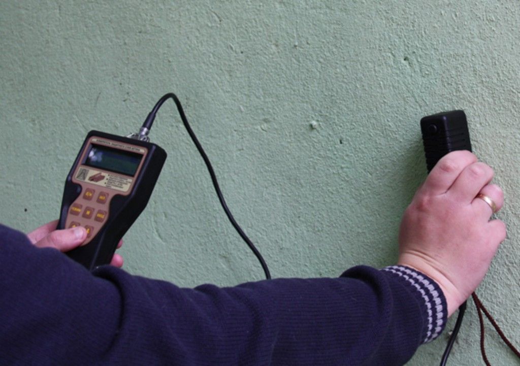 Диэлектрическая проницаемость бетона меняется с влажностью (от 1 при сухом до 30 при насыщенном). Щуп вводит электромагнитные волны и измеряет отклик.